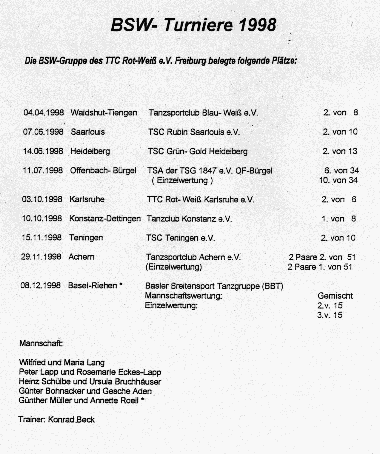 Irgendwann haben die Paare einmal gemerkt, daß man aus Tanzen mehr machen kann. Sie haben sich im Tanz-Turnier-Club Rot-Weiß zusammengefunden, um die Qualität ihres bisherigen Tanzens zu verbessern.